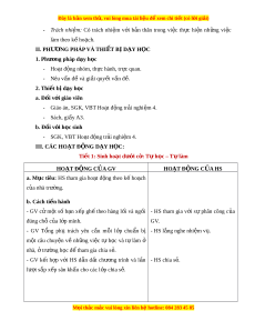 II. PHƯƠNG PHÁP VÀ THI T Ế B Ị D Y Ạ H C Ọ 1. Phư ng ơ pháp d y ạ h c ọ - Ho t ạ đ n ộ g nhóm, th c ự hành, tr c ự quan. - Nêu v n ấ đ ề và gi i ả quy t ế v n ấ đ . ề 2. Thi t ế b ị d y ạ h c ọ a. Đ i ố v i ớ giáo viên - Giáo án, SGK, VBT Ho t ạ đ n ộ g tr i ả nghi m ệ 4. - Sách, gi y ấ A3. b. Đ i ố v i ớ h c ọ sinh - SGK, VBT Ho t ạ đ n ộ g tr i ả nghi m ệ 4. III. CÁC HO T Ạ Đ N Ộ G DẠY H C Ọ : Tiết 1: Sinh ho t ạ dư i ớ c : ờ T ự h c ọ – T ự làm HOẠT ĐỘNG C A Ủ GV HO T Ạ ĐỘNG C A Ủ HS a. M c