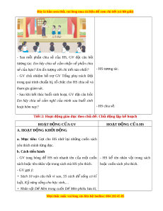 ươ g tác: Em hãy chia sẻ c m ả nh n ậ về ph n ầ chia sẻ c a ủ b n ạ ? Em n ấ t n ượ g v i ớ chi ti t ế nào nh t ấ ? - HS t n ươ g tác. - GV chủ nhi m ệ hỗ trợ GV T n ổ g phụ trách Đ i ộ trong quá trình chu n ẩ b ,ị t ổ ch c ứ cho HS chia sẻ và tham gia giám sát. - Sau khi k t ế thúc bu i ổ sinh ho t ạ , GV đ t ặ câu h i ỏ : Em hãy chia sẻ c m ả nghĩ c a ủ mình sau bu i ổ sinh ho t ạ hôm nay? - HS chia s . ẻ Tiết 2: Ho t ạ đ ng ộ giáo d c ụ theo ch ủ đ : ề Chủ đ ng ộ l p ậ k ế ho ch ạ HO T Ạ ĐỘNG C A Ủ GV HOẠT ĐỘNG C A Ủ HS A. HOẠT ĐỘNG KH I Ở Đ N Ộ G a. M c ụ tiêu: G i ợ cho HS nhớ l i ạ nh n ữ g cu n ố sách yêu thích mình t n ừ g đ c ọ . b. Cách ti n ế hành