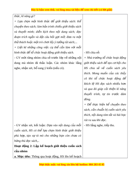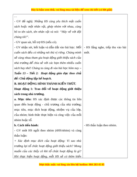 đề: Chủ đ ng ộ l p ậ k ế ho ch. ạ B. HO T Ạ Đ N Ộ G HÌNH THÀNH KI N Ế TH C Ứ Ho t ạ đ ng ộ 1: Trao đ i ổ về ho t ạ đ ng ộ gi i ớ thi u ệ sách trong nhà trư n ờ g. a. M c ụ tiêu: HS xác đ n ị h đ c ượ các thông tin liên quan đ n ế ho t ạ đ n ộ g - chủ tr n ươ g c a ủ nhà tr n ườ g; m c ụ tiêu, m c ụ đích ho t ạ đ n ộ g, nhi m ệ vụ c a ủ l p ớ , c a ủ nhóm; hình th c ứ th c ự hi n ệ và công vi c ệ c a ủ m i ỗ nhóm ho c ặ t . ổ b. Cách ti n ế hành: - HS th o ả lu n ậ theo nhóm. - GV m i ờ HS ng i