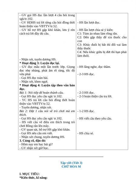 ________________________________________ Tập viết (Tiết 3) CHỮ HOA M I. MỤC TIÊU: *Kiến thức, kĩ năng: