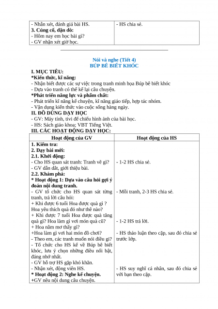 Nói và nghe (Tiết 4) BÚP BÊ BIẾT KHÓC I. MỤC TIÊU: *Kiến thức, kĩ năng:
