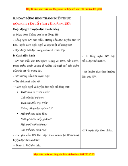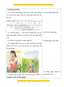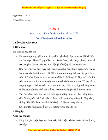 Đây là bản xem th , vu ử i lòng mua tài li u ệ đ xe ể m chi ti t ế (có l i ờ gi i ả ) Ngày so n ạ :…/…/… Ngày d y ạ :…/…/… TUẦN 13 BÀI 7: CHUYỆN C Ổ TÍCH V Ề LOÀI NGƯ I Ờ Đ c: ọ Chuy n ệ c ổ tích v ề lo i ạ ngư i ờ I. YÊU C U Ầ C N Ầ Đ T Ạ 1. Ki n ế th c ứ Sau bài h c ọ này, HS s : ẽ - Chia sẻ đ c ượ suy nghĩ, c m ả xúc sau khi nghe ho c ặ đ c ọ đo n ạ l i ờ bài hát “Cho con” – nh c ạ : Ph m ạ Tr n ọ g C u ầ , th : ơ Tu n ấ Dũng; nêu đ c ượ ph n ỏ g đoán về n i ộ dung bài đ c ọ qua tên bài, ho t ạ đ n ộ g kh i ở đ n ộ g và tranh minh h a. ọ - Đ c ọ trôi ch y ả bài đ c, ọ ng t ắ ngh ỉđúng nh p ị th , ơ đúng logic ng ữ nghĩa; tr ả l i ờ đ c ượ các câu h i ỏ tìm hi u ể bài. Hi u ể đ c ượ n i ộ dung bài h c: ọ Lí gi i ả đ c ượ m t ộ cách sinh đ n ộ g, dí d m ỏ về sự ra đ i ờ c a ủ loài ng i ườ . M i ọ thứ trên đ i ờ đ u