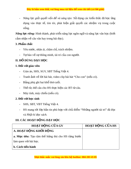 ờ bài hát, video clip bài hát “Cho con” (n u ế có). - B n ả g ph ụ ghi hai kh ổ th ơ cu i ố . - Th ẻ t , ừ th ẻ câu cho HS th c ự hi n ệ các BT t ừ câu. - Máy tính, máy chi u ế (n u ế có). 2. Đ i ố v i ớ h c ọ sinh - SHS, SBT, VBT Ti n ế g Vi t ệ 4. - HS mang t i ớ l p ớ b n ả tin phù h p ợ v i ớ ch ủ đi m ể “Nh n ữ g ng i ườ tài trí” đã đ c ọ và Nh t ậ kí đ c ọ sách. III. CÁC HO T Ạ Đ N Ộ G D Y Ạ H C Ọ HOẠT Đ N Ộ G C A Ủ GV HOẠT Đ N Ộ G C A Ủ HS A. HO T Ạ Đ N Ộ G KH I Ở Đ N Ộ G a. M c ụ tiêu: T o ạ tâm thế h n ứ g thú cho HS t n ừ g b c ướ làm quen v i ớ bài h c. ọ b. Cách ti n ế hành M i