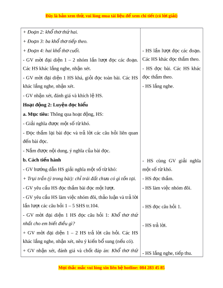 ụ tiêu: Thông qua ho t ạ đ n ộ g, HS: - L n ắ g nghe GV đ c ọ m u ẫ , h n ướ g d n ẫ đ c, ọ luy n ệ đ c ọ từ khó, luy n ệ cách ng t ắ ngh ỉvà đ c ọ m t ộ s ố dòng th . ơ - Đ c ọ đ c ượ bài đ c ọ trong nhóm và tr c ướ l p ớ . b. Cách ti n ế hành - HS l n ắ g nghe GV đ c ọ - GV đ c ọ m u ẫ cho HS nghe: Gi n ọ g vui t i ươ , h n ồ nhiên, m u ẫ , đ c ọ th m ầ theo. trong tr o ẻ ; nh n ấ gi n ọ g ở nh n