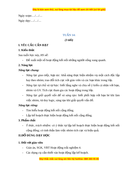 Ngày so n ạ :…/…/… Ngày d y ạ :…/…/… TUẦN 14: (3 ti t ế ) I. YÊU C U Ầ C N Ầ Đ T Ạ 1. Ki n ế th c ứ Sau tu n ầ h c ọ này, HS s : ẽ - Đ ề xu t ấ m t ộ s ố ho t ạ đ n ộ g k t ế n i ố nh n ữ g ng i ườ s n ố g xung quanh. 2. Năng l c ự Năng l c ự chung: - Năng l c ự giao ti p ế , h p