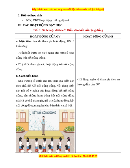 ợ tác: khả năng th c ự hi n ệ nhi m ệ vụ m t ộ cách đ c ộ l p ậ hay theo nhóm; trao đ i ổ tích c c ự v i ớ giáo viên và các b n ạ khác trong l p ớ . - Năng l c ự tự chủ và t ự h c: ọ bi t ế l n ắ g nghe và chia s ẻ ý ki n ế cá nhân v i ớ b n ạ , nhóm và GV. Tích c c ự tham gia các ho t ạ đ n ộ g trong l p ớ . - Năng l c ự gi i ả quy t ế v n ấ đề và sáng t o ạ : bi t ế ph i ố h p ợ v i ớ b n ạ bè khi làm việc nhóm, t ư duy logic, sáng t o ạ khi gi i ả quy t ế v n ấ đ . ề Năng l c ự riêng: - Tìm hi u ể ho t ạ đ n ộ g k t ế n i ố c n ộ g đ n ồ g. - L p ậ k ế ho c ạ h th c ự hi n ệ ho t ạ đ n ộ g k t ế n i ố c n ộ g đ n ồ g. 3. Phẩm ch t ấ - Ý th c, ứ trách nhi m ệ : có ý th c ứ tự l p ậ kế ho c ạ h th c ự hi n ệ ho t ạ đ n ộ g k t ế n i ố c n ộ g đồng; có tinh th n ầ làm vi c ệ nhóm tích c c ự và hi u ệ qu . ả II.ĐỒ DÙNG D Y Ạ H C Ọ 1. Đ i ố v i ớ giáo viên - Giáo án, SGK, VBT Ho t ạ đ n ộ g tr i ả nghi m ệ 4. - Các d n ụ g c ụ c n ầ thi t ế vào ho t ạ đ n ộ g l p ậ k ế ho c ạ h.