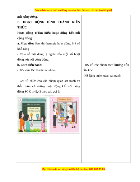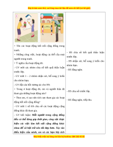 ụ tiêu: Sau khi tham gia ho t ạ đ n ộ g, HS có kh ả năng - Chia sẻ n i ộ dung, ý nghĩa c a ủ m t ộ số ho t ạ đ n ộ g k t ế n i ố c n ộ g đ n ồ g. b. Cách ti n ế hành: - HS về các nhóm theo h n ướ g d n ẫ - GV chia l p ớ thành các nhóm. c a ủ GV. - HS l n ắ g nghe, quan sát tranh. - GV tổ ch c
