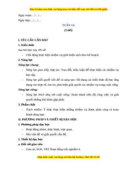 ệ đ xe ể m chi ti t (c ế ó lời gi i ả ) Ngày so n ạ :…/…/… Ngày d y ạ :…/…/… TUẦN 14: (3 ti t ế ) I. YÊU C U Ầ C N Ầ Đ T Ạ 1. Ki n ế th c ứ Sau bài h c ọ này, HS s : ẽ - Ch ủ đ n ộ g th c ự hi n ệ nhi m ệ v ụ gi i ớ thi u ệ sách theo k ế ho ch ạ . 2. Năng l c ự Năng l c ự chung: - Năng l c ự giao ti p ế , h p ợ tác: Trao đ i ổ , th o ả lu n ậ để th c ự hi n ệ các nhi m ệ vụ h c ọ t p ậ . - Năng l c ự gi i ả quy t ế v n ấ đề và sáng t o ạ : Sử d n ụ g các ki n ế th c ứ đã h c ọ n ứ g d n ụ g vào th c ự t , ế tìm tòi, phát hi n ệ gi i ả quy t ế các nhi m ệ v ụ trong cu c ộ s n ố g. Năng l c ự riêng: - Năng l c ự thích n ứ g v i ớ cu c ộ s n
