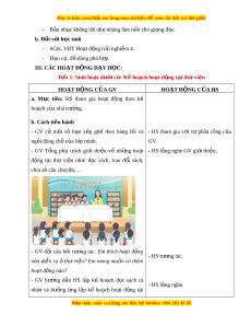 ệ đ xe ể m chi ti t (c ế ó lời gi i ả ) th ư vi n ệ . - Sau khi k t ế thúc bu i ổ sinh ho t ạ , GV đ t ặ câu - HS chia s . ẻ h i ỏ : Em hãy chia s ẻ c m ả nghĩ c a ủ mình sau bu i ổ sinh ho t ạ hôm nay? Tiết 2: Ho t ạ đ ng ộ giáo d c ụ theo ch ủ đ : ề Luyện t p ậ gi i ớ thi u ệ sách HO T Ạ ĐỘNG C A Ủ GV HOẠT ĐỘNG C A Ủ HS A. HOẠT ĐỘNG KH I Ở Đ N Ộ G a. M c