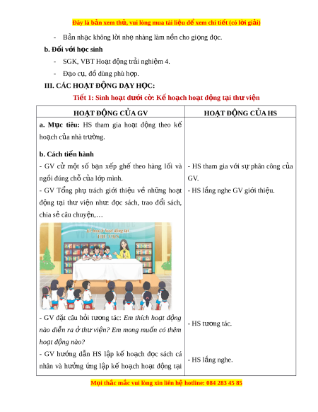 ệ đ xe ể m chi ti t (c ế ó lời gi i ả ) - B n ả nh c ạ không l i ờ nh ẹ nhàng làm n n ề cho gi n ọ g đ c ọ . b. Đ i ố v i ớ h c ọ sinh - SGK, VBT Ho t ạ đ n ộ g tr i ả nghi m ệ 4. - Đ o ạ c , ụ đ ồ dùng phù h p ợ . III. CÁC HO T Ạ Đ N Ộ G DẠY H C Ọ : Tiết 1: Sinh ho t ạ dư i ớ c : ờ K ế ho ch ạ ho t ạ đ ng ộ t i ạ th ư vi n ệ HO T Ạ ĐỘNG C A Ủ GV HO T Ạ ĐỘNG C A Ủ HS a. M c