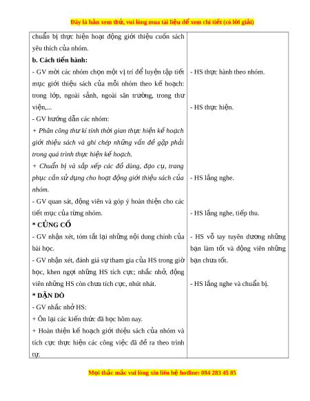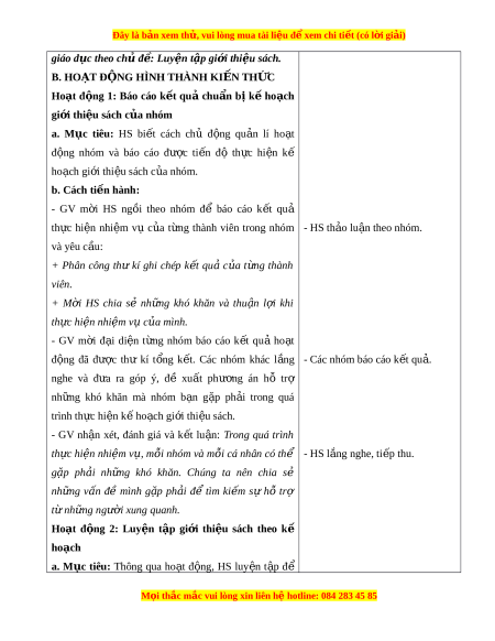 ệ đ xe ể m chi ti t (c ế ó lời gi i ả ) giáo d c ụ theo ch ủ đ : ề Luy n ệ t p ậ gi i ớ thi u ệ sách. B. HO T Ạ Đ N Ộ G HÌNH THÀNH KI N Ế TH C Ứ Ho t ạ đ ng ộ 1: Báo cáo k t ế quả chu n ẩ b ị kế ho ch ạ gi i ớ thi u ệ sách c a ủ nhóm a. M c ụ tiêu: HS bi t ế cách chủ đ n ộ g qu n ả lí ho t ạ đ n ộ g nhóm và báo cáo đ c ượ ti n ế độ th c ự hi n ệ kế ho c ạ h gi i ớ thi u ệ sách c a ủ nhóm. b. Cách ti n ế hành: - GV m i ờ HS ng i