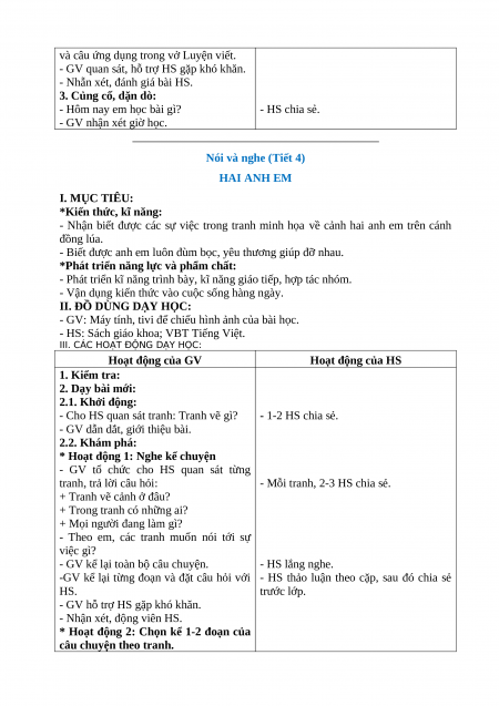 Nói và nghe (Tiết 4) HAI ANH EM I. MỤC TIÊU: *Kiến thức, kĩ năng:
