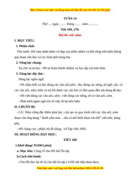 Thứ …. ngày …… tháng …… năm ………. Tiết 169, 170: Bài 66: uôi, uôm I. MỤC TIÊU: 1. Phẩm chất: