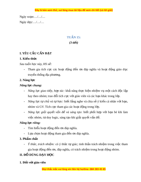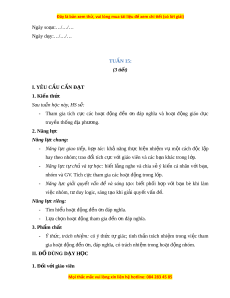 Ngày so n ạ :…/…/… Ngày d y ạ :…/…/… TUẦN 15: (3 ti t ế ) I. YÊU C U Ầ C N Ầ Đ T Ạ 1. Ki n ế th c ứ Sau tu n ầ h c ọ này, HS s : ẽ - Tham gia tích c c ự các ho t ạ đ n ộ g đ n ề n ơ đáp nghĩa và ho t ạ đ n ộ g giáo d c ụ truy n ề th n ố g đ a ị ph n ươ g. 2. Năng l c ự Năng l c ự chung: - Năng l c ự giao ti p ế , h p
