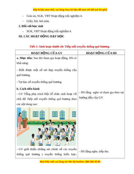 - Giáo án, SGK, VBT Ho t ạ đ n ộ g tr i ả nghi m ệ 4. - Gi y ấ , bút, bút màu. 2. Đ i ố v i ớ h c ọ sinh - SGK, VBT Ho t ạ đ n ộ g tr i ả nghi m ệ 4. III. CÁC HO T Ạ Đ N Ộ G DẠY H C Ọ Tiết 1: Sinh ho t ạ dư i ớ c : ờ Ti p ế n i ố truy n ề th n ố g quê hư ng ơ . HO T Ạ ĐỘNG C A Ủ GV HO T Ạ ĐỘNG C A Ủ HS a. M c