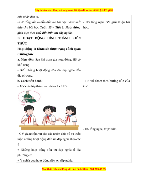 ọ : Video mở - HS l n ắ g nghe GV gi i ớ thi u ệ bài đ u ầ cho bài h c ọ Tu n ầ 15 – Ti t ế 2: Ho t ạ đ n ộ g h c. ọ giáo d c ụ theo ch ủ đ : ề Đ n ề n ơ đáp nghĩa. B. HO T Ạ Đ N Ộ G HÌNH THÀNH KI N Ế THỨC Ho t ạ đ ng ộ 1: Kh o ả sát th c ự tr ng ạ c nh ả quan trư ng ờ h c. ọ a. M c