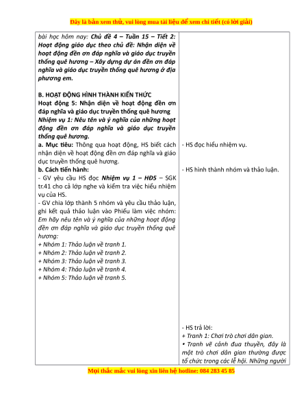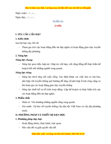 ệ đ xe ể m chi ti t (c ế ó lời gi i ả ) Ngày so n ạ :…/…/… Ngày d y ạ :…/…/… TUẦN 15: (3 ti t ế ) I. YÊU C U Ầ C N Ầ Đ T Ạ 1. Ki n ế th c ứ Sau bài h c ọ này, HS s : ẽ - Tham gia tích c c ự ho t ạ đ n ộ g đ n ề n ơ đáp nghĩa và ho t ạ đ n ộ g giáo d c ụ truy n ề th n ố g đ a ị ph n ươ g. 2. Năng l c ự Năng l c ự chung: - Năng l c ự giao ti p ế , h p ợ tác: H p ợ tác v i ớ b n ạ , v i ớ c n ộ g đ n ồ g đ ể th c ự hi n ệ kế ho ch ạ k t ế n i ố nh n ữ g ng i ườ xung quanh. Năng l c ự riêng: - Năng l c ự thích n ứ g v i ớ cu c ộ s n ố g: Xác đ n ị h đ c ượ các vi c ệ làm có văn hóa, phù h p ợ v i ớ truy n ề th n ố g quê h n ươ g đ ể n ứ g x ử phù h p ợ ở n i ơ công c n ộ g và khi tham gia các ho t ạ đ n ộ g giáo d c ụ truy n ề th n ố g. - Năng l c ự thi t ế kế và tổ ch c ứ ho t ạ đ n ộ g: L p ậ kế ho c ạ h và th c ự hi n ệ tích c c ự các ho t ạ đ n ộ g đ n ề n ơ đáp nghĩa. 3. Phẩm ch t ấ