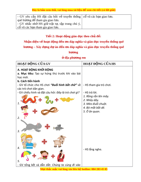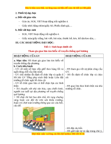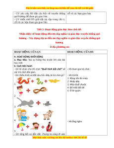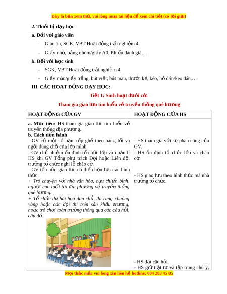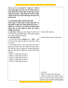 ệ đ xe ể m chi ti t (c ế ó lời gi i ả ) 2. Thi t ế b ị d y ạ h c ọ a. Đ i ố v i ớ giáo viên - Giáo án, SGK, VBT Ho t ạ đ n ộ g tr i ả nghi m ệ 4. - Gi y ấ nh , ớ b n ả g nhóm/gi y ấ A0, Phi u ế đánh giá,… b. Đ i ố v i ớ h c ọ sinh - SGK, VBT Ho t ạ đ n ộ g tr i ả nghi m ệ 4. - Gi y ấ màu/gi y ấ tr n ắ g, bút vi t ế , bút màu, th c ướ k , ẻ kéo, h ồ dán/keo dán,… III. CÁC HO T Ạ Đ N Ộ G DẠY H C Ọ : Tiết 1: Sinh ho t ạ dư i ớ c : ờ Tham gia giao l u ư tìm hi u ể v ề truy n ề th ng ố quê hư ng ơ HOẠT ĐỘNG C A Ủ GV HO T Ạ ĐỘNG C A Ủ HS a. M c