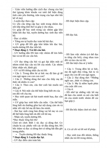 - Hiểu nội dung bài đọc: Nhận biết được tình cảm yêu thương, sự quan tâm, săn sóc của mẹ dành cho con.