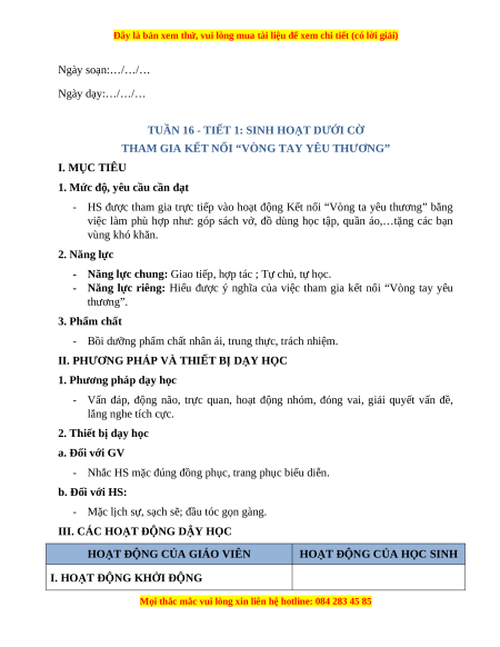 - Năng lực riêng: Hiểu được ý nghĩa của việc tham gia kết nối “Vòng tay yêu thương”. 3. Phẩm chất