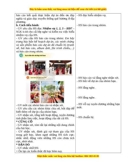 ệ đ xe ể m chi ti t (c ế ó lời gi i ả ) báo cáo k t ế quả th c ự hi n ệ dự án đ n ề n ơ đáp - HS đ c ọ hi u ể nhi m ệ v . ụ nghĩa và giáo d c ụ truy n ề th n ố g quê h n ươ g ở đ a ị ph n ươ g. b. Cách ti n ế hành: - HS báo cáo trong nhóm. - GV yêu c u ầ HS đ c