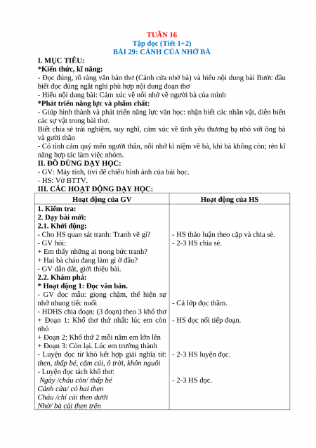 BÀI 29: CÁNH CỦA NHỚ BÀ I. MỤC TIÊU: *Kiến thức, kĩ năng: