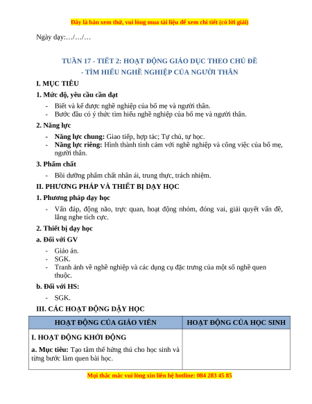 - Năng lực riêng: Hình thành tình cảm với nghề nghiệp và công việc của bố mẹ, người thân. 3. Phẩm chất