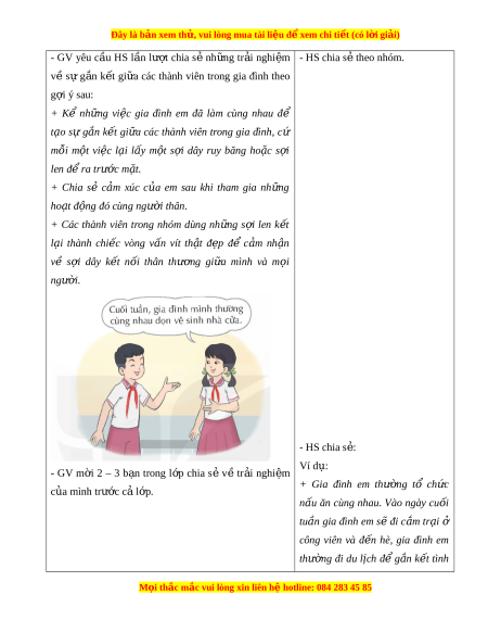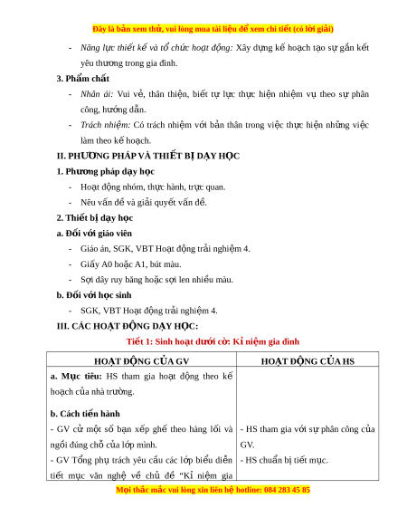 II. PHƯƠNG PHÁP VÀ THI T Ế B Ị D Y Ạ H C Ọ 1. Phư ng ơ pháp d y ạ h c ọ - Ho t ạ đ n ộ g nhóm, th c ự hành, tr c ự quan. - Nêu v n ấ đ ề và gi i ả quy t ế v n ấ đ . ề 2. Thi t ế b ị d y ạ h c ọ a. Đ i ố v i ớ giáo viên - Giáo án, SGK, VBT Ho t ạ đ n ộ g tr i ả nghi m ệ 4. - Gi y ấ A0 ho c ặ A1, bút màu. - S i ợ dây ruy băng ho c ặ s i ợ len nhi u ề màu. b. Đ i ố v i ớ h c ọ sinh - SGK, VBT Ho t ạ đ n ộ g tr i ả nghi m ệ 4. III. CÁC HO T Ạ Đ N Ộ G DẠY H C Ọ : Tiết 1: Sinh ho t ạ dư i ớ c : ờ K ỉ ni m ệ gia đình HO T Ạ ĐỘNG C A Ủ GV HO T Ạ ĐỘNG C A Ủ HS a. M c