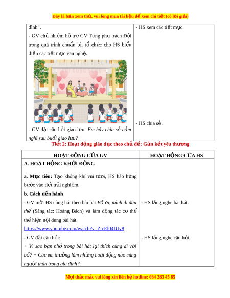 ệ đ xe ể m chi ti t (c ế ó lời gi i ả ) đình”. - HS xem các ti t ế m c ụ . - GV chủ nhi m ệ hỗ trợ GV T n ổ g phụ trách Đ i ộ trong quá trình chu n ẩ b ,ị tổ ch c ứ cho HS bi u ể di n ễ các ti t ế m c ụ văn ngh . ệ - HS chia s . ẻ - GV đ t ặ câu h i ỏ giao l u