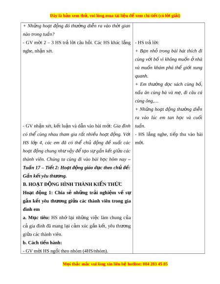 thành viên. Chúng ta cùng đi vào bài h c ọ hôm nay – Tu n ầ 17 – Ti t ế 2: Ho t ạ đ ng ộ giáo d c ụ theo ch ủ đ : ề G n ắ k t ế yêu thư ng ơ . B. HO T Ạ Đ N Ộ G HÌNH THÀNH KI N Ế TH C Ứ Ho t ạ đ ng ộ 1: Chia sẻ nh ng ữ tr i ả nghi m ệ về sự g n ắ k t ế yêu thư n ơ g gi a