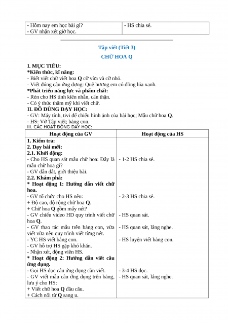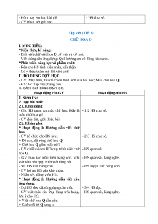 __________________________________________ Tập viết (Tiết 3) CHỮ HOA Q I. MỤC TIÊU: *Kiến thức, kĩ năng: