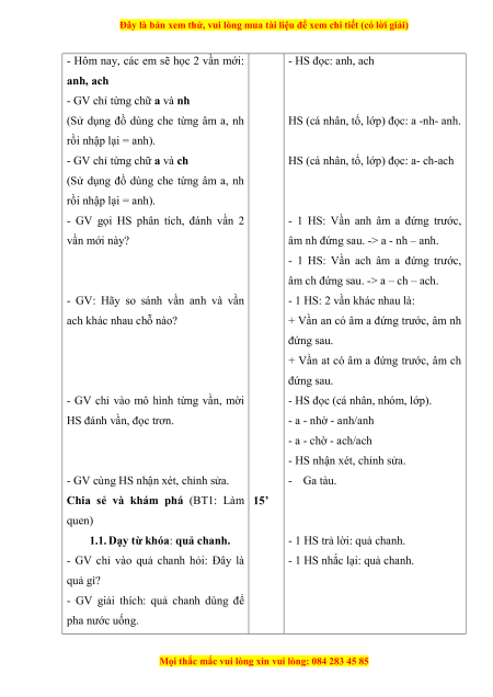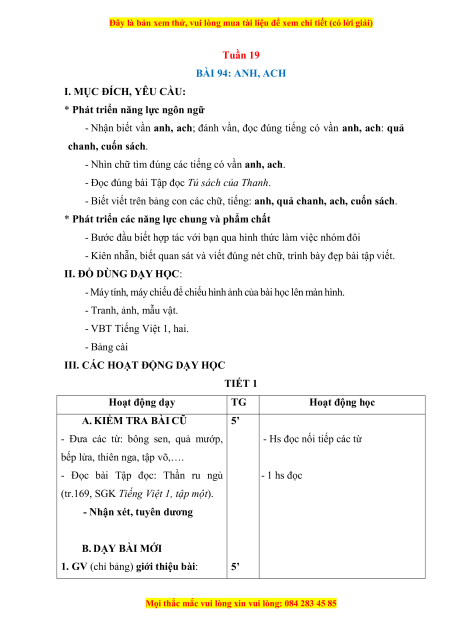 Đây là bản xem thử, vui lòng mua tài liệu để xem chi tiết (có lời giải) Tuần 19 BÀI 94: ANH, ACH I. MỤC ĐÍCH, YÊU CẦU: