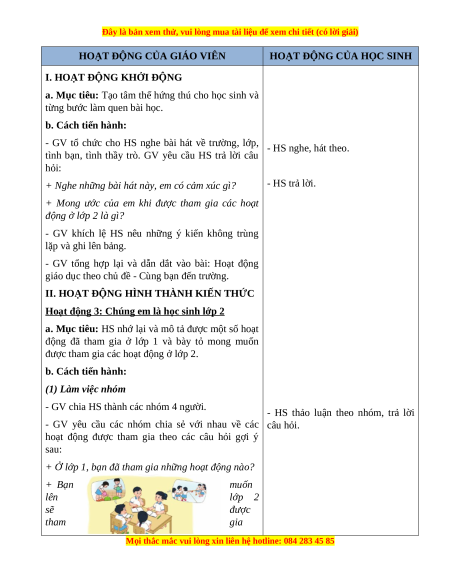 được tham gia các hoạt động ở lớp 2. b. Cách tiến hành: