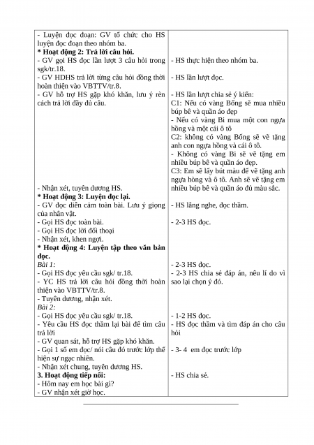 - GV gọi HS đọc lần lượt 3 câu hỏi trong - HS thực hiện theo nhóm ba. sgk/tr.18.
