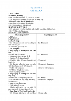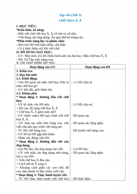 __________________________________________ Tập viết (Tiết 3) CHỮ HOA Ă, Â I. MỤC TIÊU: *Kiến thức, kĩ năng: