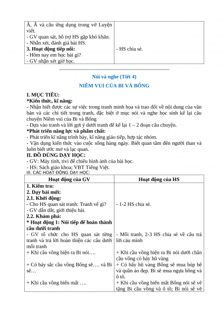 NIỀM VUI CỦA BI VÀ BỐNG I. MỤC TIÊU: *Kiến thức, kĩ năng: