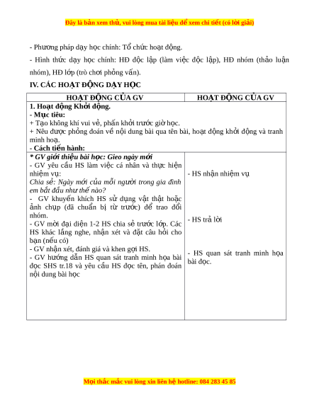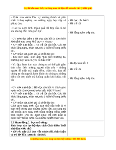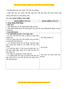 ệ đ xe ể m chi ti t ế (có l i ờ gi i ả ) - Phư ng pháp d ơ y ạ h c chí ọ nh: T ch ổ c ho ứ t ạ đ ng. ộ - Hình th c ứ d y ạ h c ọ chính: HĐ đ c ộ l p ậ (làm vi c ệ đ c ộ l p) ậ , HĐ nhóm (th o ả lu n ậ nhóm), HĐ l p ( ớ trò ch i ơ ph ng v ỏ n ấ ). IV. CÁC HO T Ạ Đ N Ộ G D Y Ạ H C Ọ HOẠT Đ N Ộ G C A Ủ GV HOẠT Đ N Ộ G C A Ủ GV 1. Hoạt đ ng K ộ h i ở đ ng. ộ - M c t ụ iêu: + T o không khí ạ vui v , ph ẻ n kh ấ i ở trư c gi ớ ờ h c. ọ + Nêu đư c ợ ph ng ỏ đoán về n i