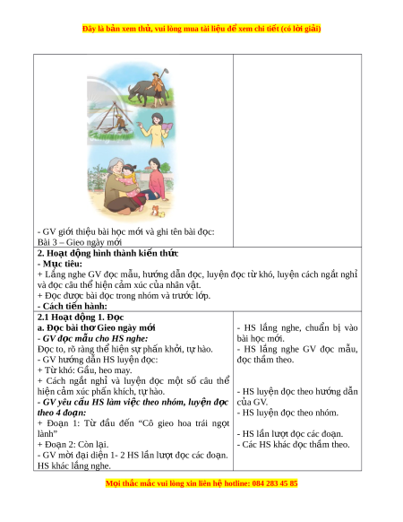 ệ đ xe ể m chi ti t ế (có l i ờ gi i ả ) - GV gi i ớ thi u bài ệ h c ọ m i ớ và ghi tên bài đ c: ọ Bài 3 – Gieo ngày m i ớ 2. Hoạt đ ng h ộ ình thành ki n t ế h c ứ - M c t ụ iêu: + L ng ắ nghe GV đ c ọ m u, ẫ hư ng ớ d n ẫ đ c, ọ luy n ệ đ c ọ t ừ khó, luy n ệ cách ng t ắ nghỉ và đ c ọ câu th hi ể n c ệ m ả xúc c a nhân v ủ t ậ . + Đ c ọ đư c bài ợ đ c ọ trong nhóm và trư c l ớ p. ớ - Cách ti n hành ế : 2.1 Hoạt đ ng 1. Đ ộ c ọ a. Đ c
