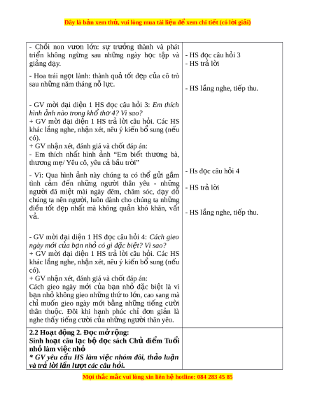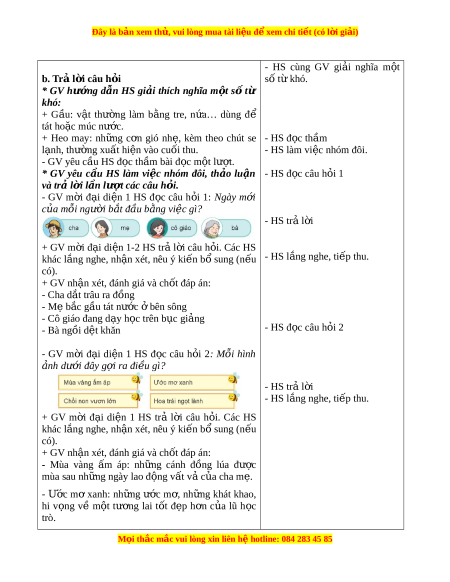 ợ các câu h i ỏ . - GV m i ờ đ i ạ di n ệ 1 HS đ c ọ câu h i ỏ 1: Ngày m i ớ c a ủ mỗi ngư i ờ b t ắ đ u b ầ ng vi ằ c gì ệ ? - HS tr l ả i ờ + GV m i ờ đ i ạ di n ệ 1-2 HS tr ả l i ờ câu h i ỏ . Các HS khác l ng ắ nghe, nh n ậ xét, nêu ý ki n ế b s ổ ung (n u ế - HS l ng ắ nghe, ti p t ế hu. có). + GV nh n xét ậ , đánh giá và ch t ố đáp án: - Cha d t ắ trâu ra đ ng ồ - Mẹ b c ắ g u t ầ át nư c ớ bên ở sông - Cô giáo đang d y h ạ c t ọ rên b c gi ụ ng ả - Bà ngồi d t ệ khăn - HS đ c ọ câu h i ỏ 2 - GV m i ờ đ i ạ di n ệ 1 HS đ c ọ câu h i ỏ 2: Mỗi hình nh ả dư i ớ đây g i ợ ra đi u gì ề ? - HS tr l ả i ờ - HS l ng ắ nghe, ti p t ế hu. + GV m i ờ đ i ạ di n ệ 1 HS trả l i ờ câu h i ỏ . Các HS khác l ng ắ nghe, nh n ậ xét, nêu ý ki n ế b s ổ ung (n u ế có). + GV nh n xét ậ , đánh giá và ch t ố đáp án: - Mùa vàng m ấ áp: nh ng ữ cánh đ ng ồ lúa đư c ợ mùa sau nh ng ngày l ữ ao đ ng ộ v t ấ v c ả a cha ủ m . ẹ - c Ướ mơ xanh: nh ng ữ ư c ớ m , ơ nh ng ữ khát khao, hi v ng ọ về m t ộ tư ng ơ lai t t ố đ p ẹ h n ơ c a ủ lũ h c ọ trò. M i