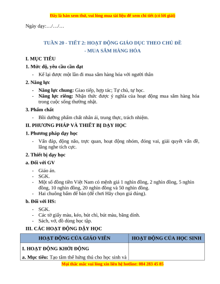 TUẦN 20 - TIẾT 2: HOẠT ĐỘNG GIÁO DỤC THEO CHỦ ĐỀ - MUA SẮM HÀNG HÓA I. MỤC TIÊU