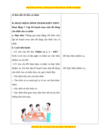 Hoạt động 7: Lập kế hoạch mua sắm đồ dùng