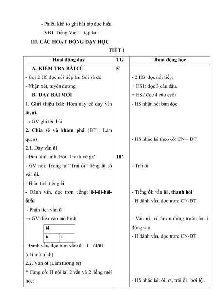 - Nhận biết các vần ôi, ơi; đánh vần, đọc đúng tiếng có các vần ôi, ơi.