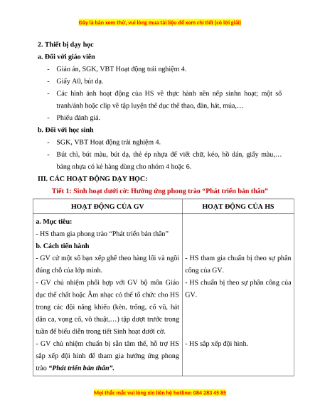 Tiết 1: Sinh hoạt dưới cờ: Hưởng ứng phong trào “Phát triển bản thân” HOẠT ĐỘNG CỦA GV HOẠT ĐỘNG CỦA HS a. Mục tiêu: