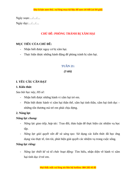- Thực hiện được những hành động để phòng tránh bị xâm hại. TUẦN 21: (3 tiết)