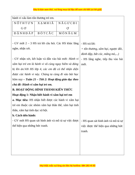 Tiết 2: Hoạt động giáo dục theo chủ đề: Hành vi xâm hại trẻ em HOẠT ĐỘNG CỦA GV HOẠT ĐỘNG CỦA HS