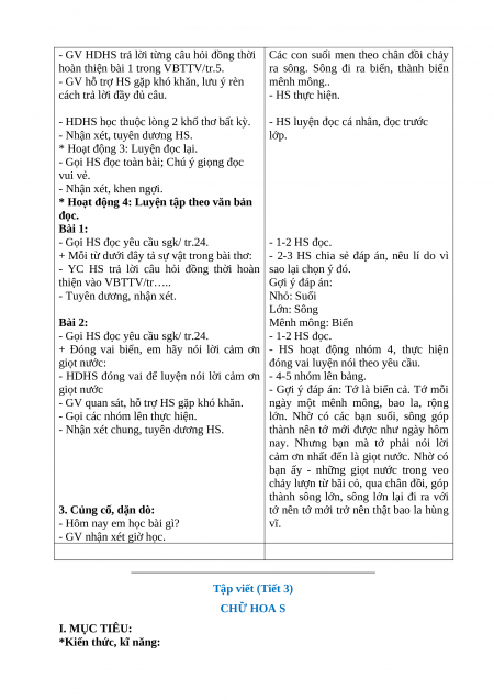__________________________________________ Tập viết (Tiết 3) CHỮ HOA S I. MỤC TIÊU: *Kiến thức, kĩ năng: