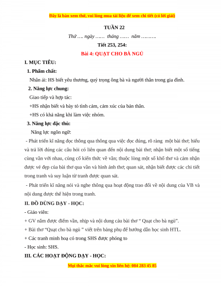 Bài 4: QUẠT CHO BÀ NGỦ I. MỤC TIÊU: 1. Phẩm chất: