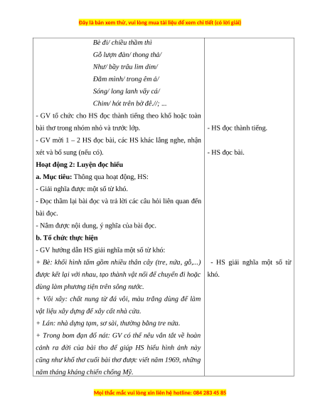 các câu hỏi tìm hiểu bài. Hiểu được nội dung của bài đọc: Miêu tả cảnh bè xuôi sông