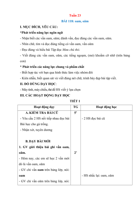Tuần 23 BÀI 118: oam, oăm I. MỤC ĐÍCH, YÊU CẦU: