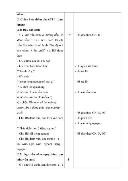 2. Chia sẻ và khám phá (BT 1: Làm quen) 2.1: Dạy vần oam